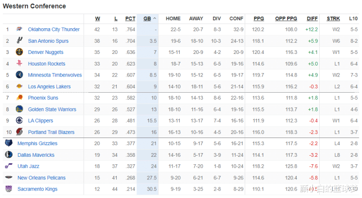 雷霆42胜13负,马刺38胜16负;雷霆逾越掘金7个胜场,马刺逾越掘金3.5个胜场,很显着雷霆、马刺在一个端倪。