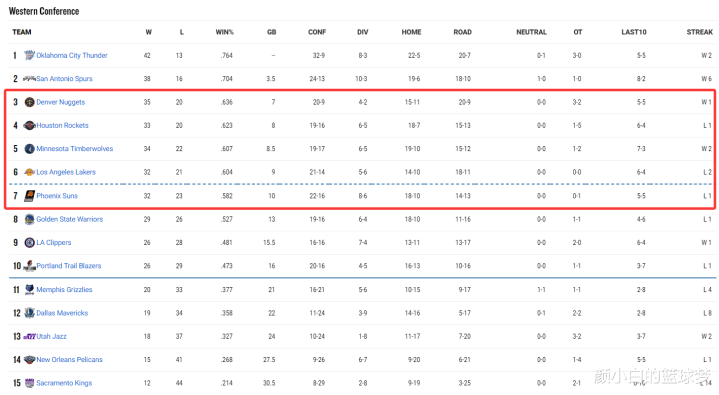 太阳行为西部第七只逾期湖东谈主1个胜场,太阳逾越西部第八的英雄3个胜场,英雄则逾越快船2.5个胜场。