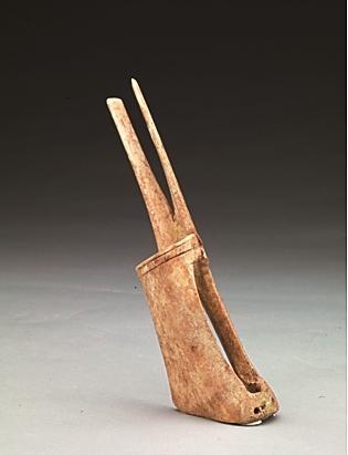 如今漯河市博物馆第一展厅中,就保藏有一件叉形骨器。它造型奇特,上有双尖如鹿角,下分两面,一侧呈钩状,一侧似刀刃,通体光滑温润,仿佛还残留着先民的体温。