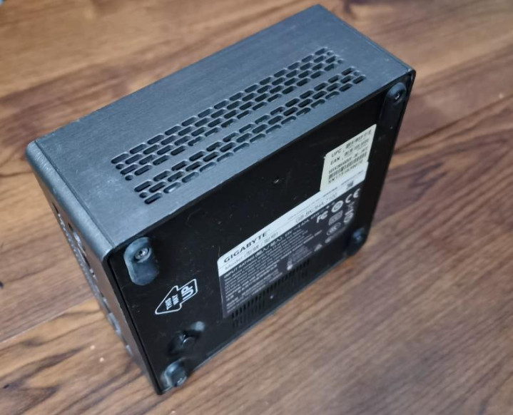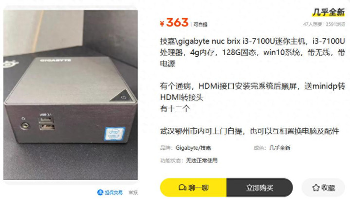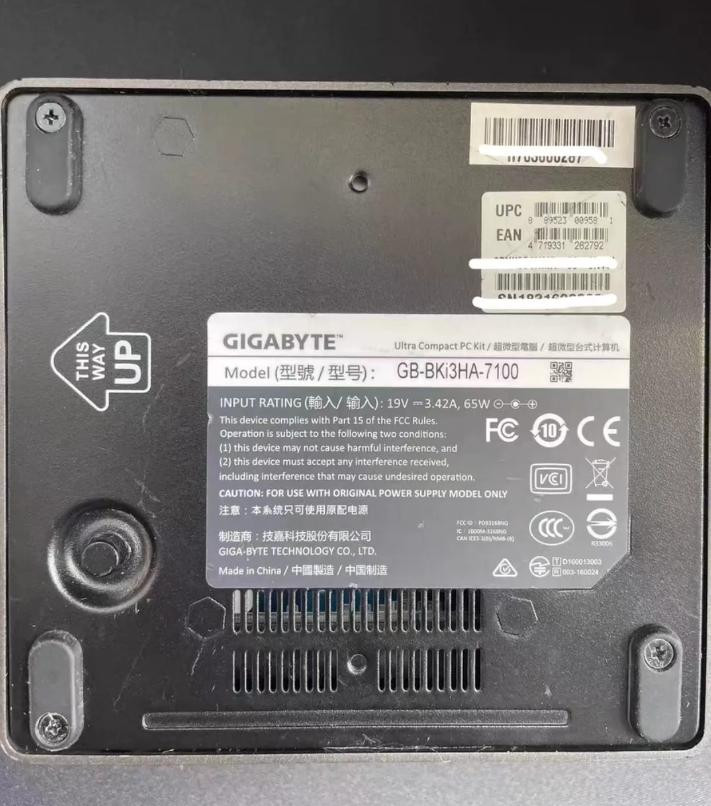 二手鱼里刷到一台技嘉的迷你主机,卖家挂价363元,处理器是酷睿i3 7100u。嗅觉这机器质感可以,开机键盘算在顶部很轻便,4G+128G带电源,还带无线,唯独问题是有个通病,HDMi接口装配完系统后黑屏,但可以通过minidp转HDMI转讨论处分,卖家写了施济。