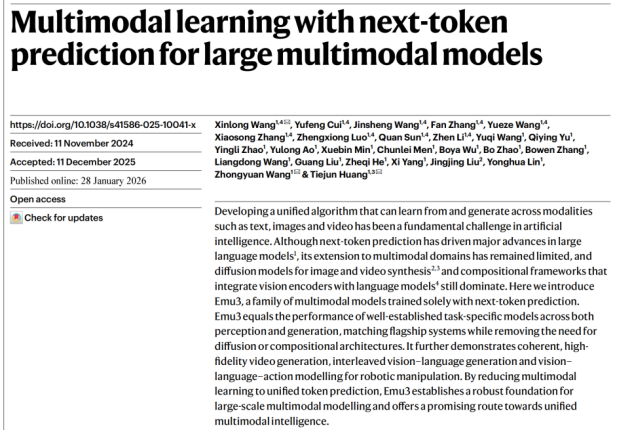 几天前,《Nature》杂志刊发了一篇来自中国的东说念主工智能策划论文。这在顶级学术期刊上并非极新事,但这篇论文的重量却非同小可:它来自北京智源东说念主工智能策划院,中枢效果是一个名为“Emu3”的多模态大模子,而它试图修起的问题,是系数AI领域已往五年来悬而未决的中枢命题——咱们能否用一种长入的步地,让机器同期学会看、听、说、写,乃至算作?