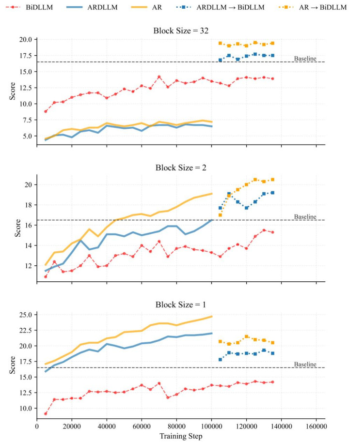 (1)AR->BiDLLM: 用 AR 的神气不竭锻练,在 100k step 的时刻 CPT 成双向的 DLLM。