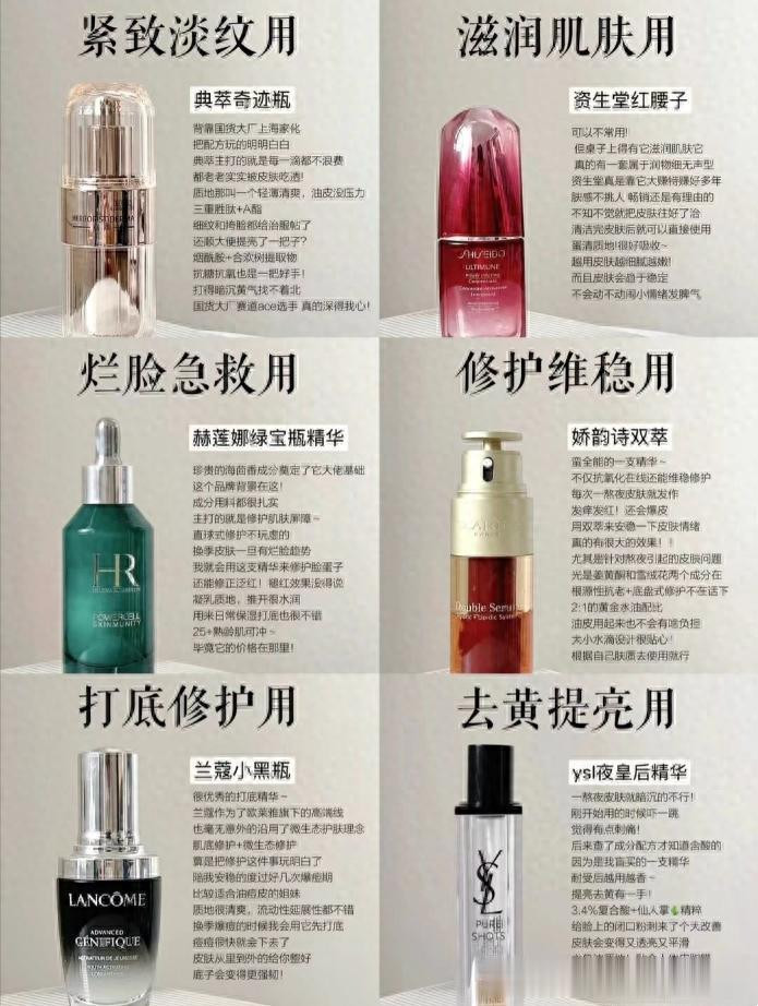 关于这6款大牌修护抗老精华来说,它们有的是沉稳保湿,有的滋养润滑,有的是改善干敏、修护的作用,还有提亮、抗软弱等多样不同的作用,无论是哪种精华的因素和搭配,皆会给咱们干敏肌肤带来护肤念念路和法子,如果你亦然这种肤质,这些精华径直脱手就行。