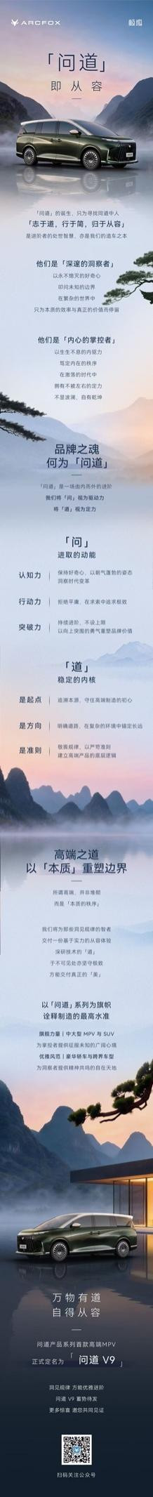 “问谈”家具系列是北汽极狐一场由内而外的品牌进阶。“问”代表品牌朝上的驱能源——以融会力洞悉时期变革,以行能源追求极致,以打破力重塑价值,展现不设限的着手姿态。“谈”标志品牌服从的定力——守住高端制造的初心,锚定长久发展标的,服从严苛品性准则,从而奠定家具坚实的价值内核。“问谈”系列将承载北汽极狐最高的制造水准,kaiyun sports聚焦于中大型MPV与SUV等旗舰家具,为掌控者提供投降未知的广袤心思。行动北汽极狐首款高端MPV,问谈V9基于北极星架构与ARC-FLOW筹划玄学打造,领有5300mm车长与3200mm超长轴距。