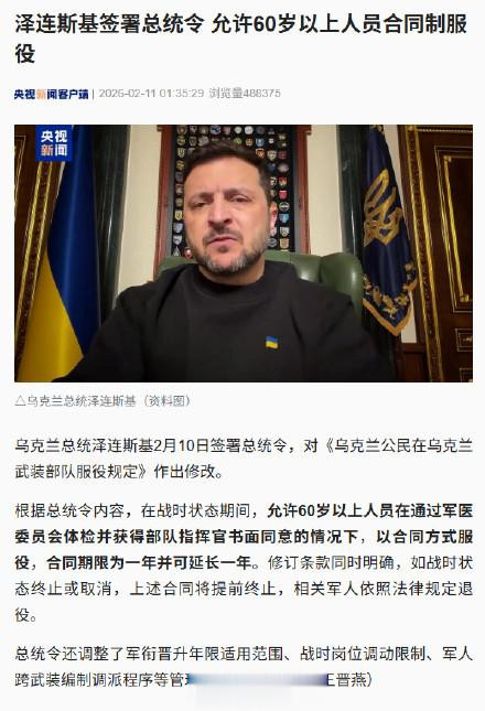 乌克兰总统泽连斯基2月10日签署总统令,对《乌克兰公民在乌克兰武装军队入伍礼貌》作出修改。