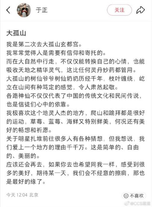 在其他明星艺东谈主长期保执千里默之际,一样去过大孤山两次的于正坐不住了,昨天用一则动态回答了“明星扎堆是否搞哲学”的各式料想。