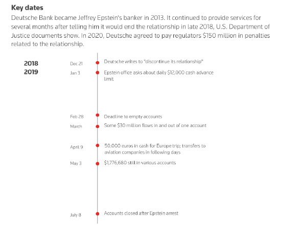 德领路银行莫得回答路透就本报报说念的买卖提议的详备问题,这些买卖领路,德领路银行与爱泼斯坦的关系执续了数月。