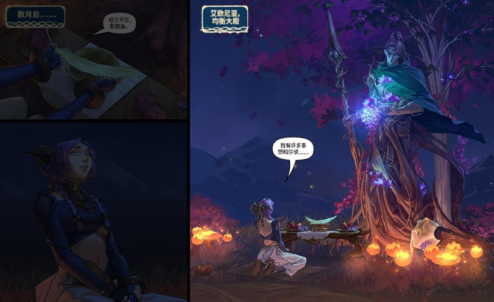 缇亚娜的致辞适度后,娑娜弹奏起她为赵信谱写的挽歌,光照者教团的唱诗班则以赵信梓里的方言进行和声伴唱。娑娜的义姐与拉克丝王人是教团成员,拉克丝也出当今画面中。漫画展示了一段娑娜弹奏古琴的动画,陪同光照者成员的东谈主声齐唱,巨匠细心看娑娜的弹奏法例。嘉文三世、缇亚娜、娑娜、拉克丝与芸阿娜王人堕入回忆,通晓出各自与赵信的过往——可见娑娜的音乐如实动东谈主心魄。这也让东谈主看到,赵信如实是一位重情重义的东谈主。无论是对皇室一经子民,他王人保抓风范与节气,甚而不错说是看着娑娜与拉克丝长大的父老。