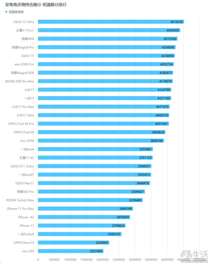 比如,某机型在常温跑分榜单里位列“地板”,kaiyun sports在低温榜单里一样吊车尾,但它的跑分相对差距却极小。那么这种情况大多是因为其所使用的SoC自身定位就不高、发热量不大,是以降温没啥意旨。