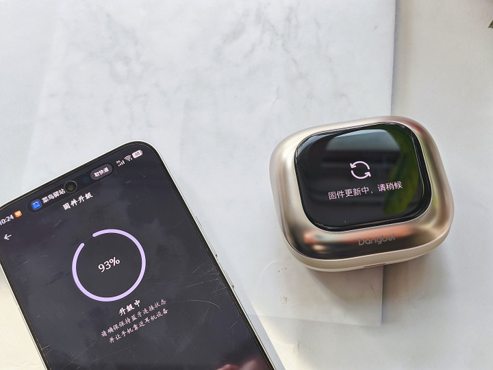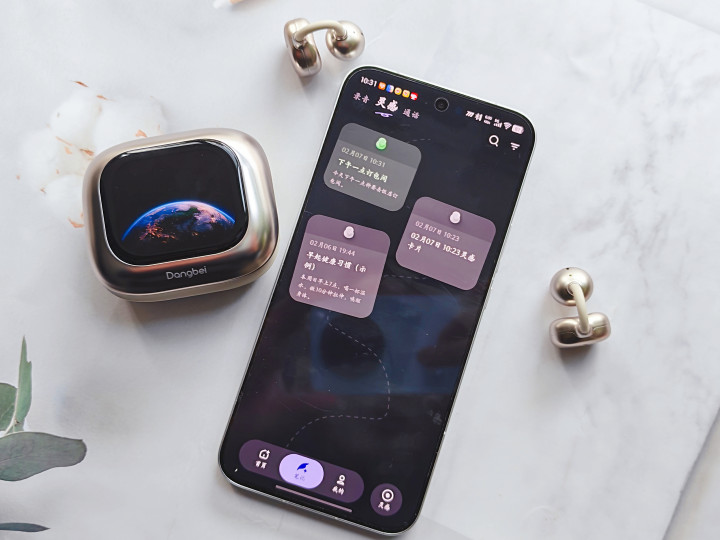 确凿的惊喜来自充电盒。它果然内置了一块2.04英寸的AMOLED彩屏!颜色缓和,亮度迷漫,阳光下也能看清。这可不是胪列——电量、歌曲信息、致使可以径直切歌、调音效,还能玩个性壁纸。