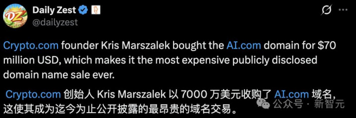 就在刚刚,Crypto.com独创东谈主Kris Marszalek,豪掷7000万好意思元(约折合东谈主民币5个亿)天价购入AI.com域名,总共硅谷科技圈炸了。
